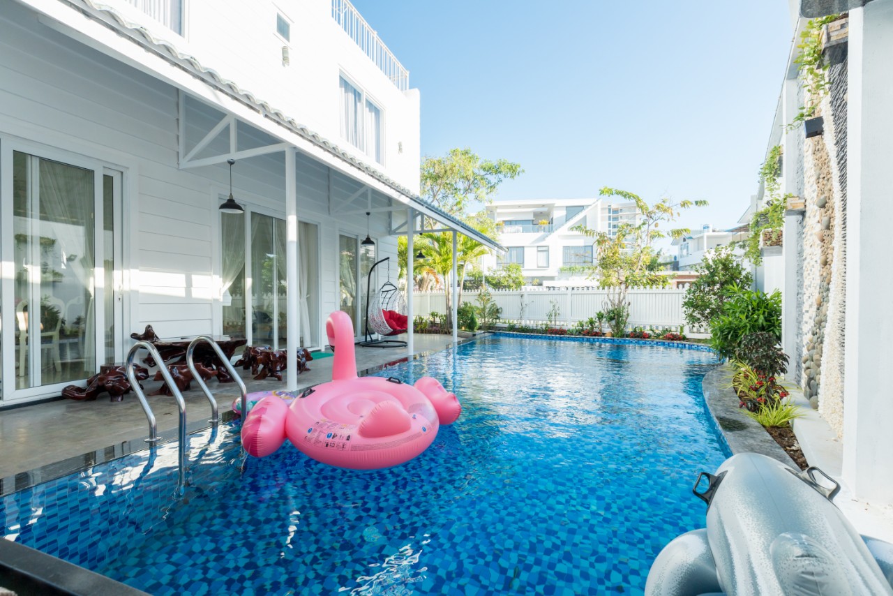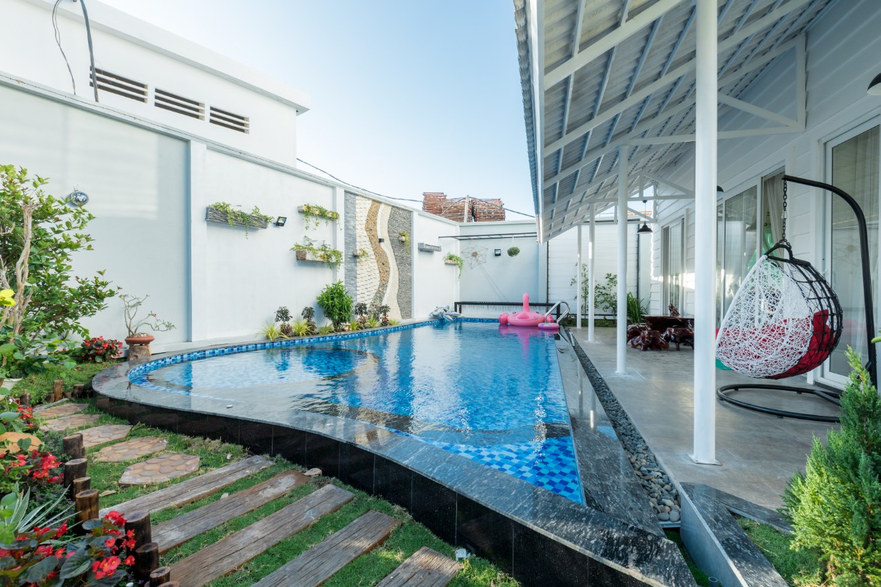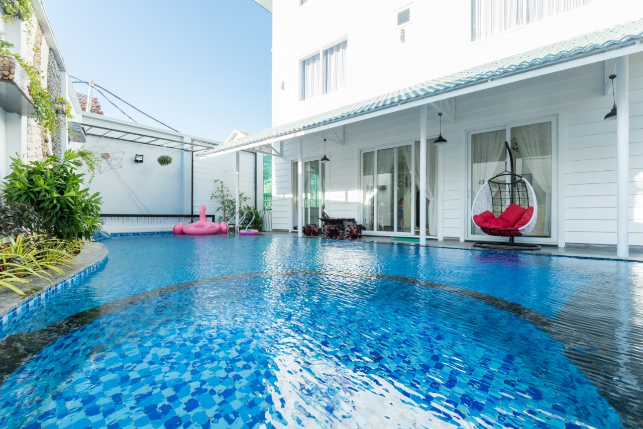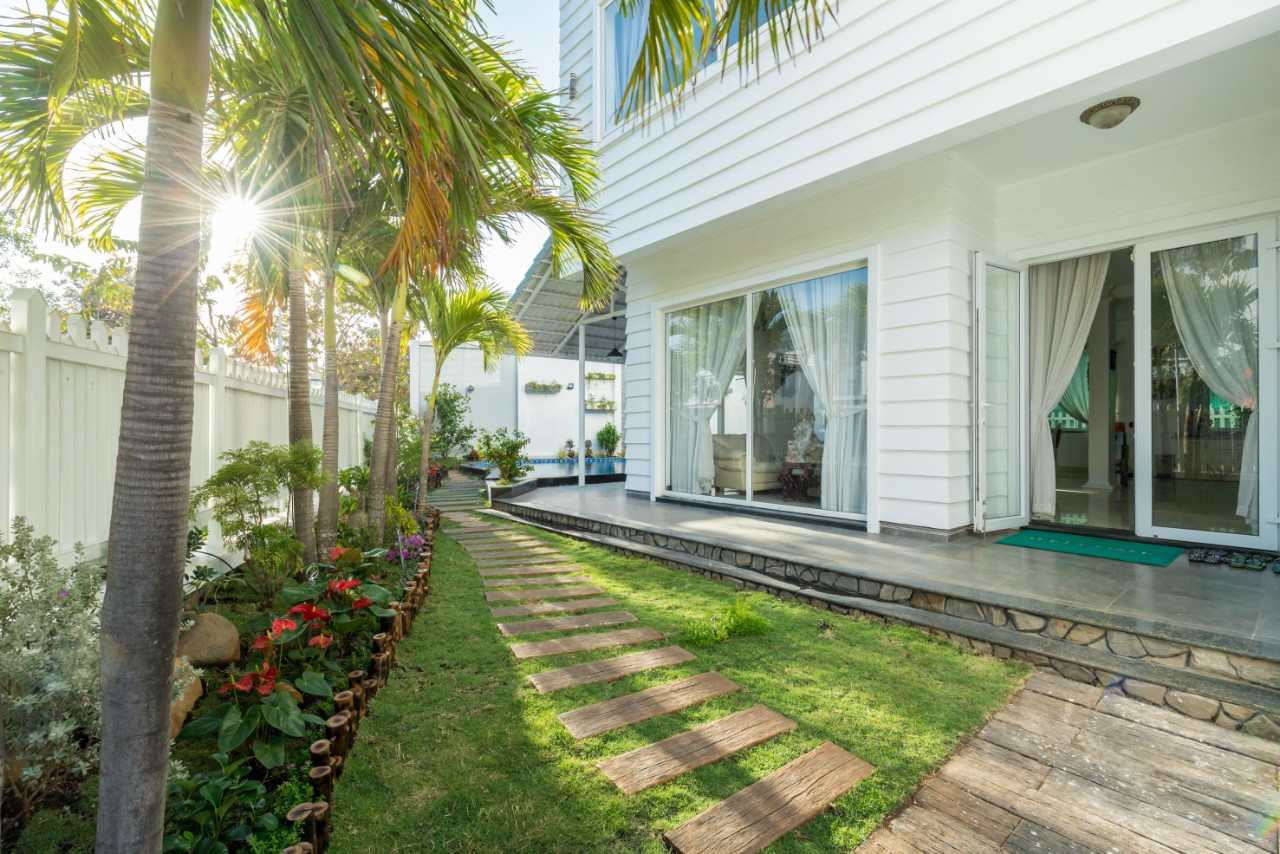 1 trong những villa có khuôn viên cây cối xanh tươi mát lành, tựa như đang ở Đà Lạt mộng mơ vậy. Hồ bơi rộng lớn, sân vườn bốn mùa xanh tươi, tạo cảm giác dịu mát và vô cùng dễ chịu. Các phòng đều được đón gió từ biển khơi, chắc chắn sẽ đem lại nhiều cảm xúc khác lạ cho du khách.