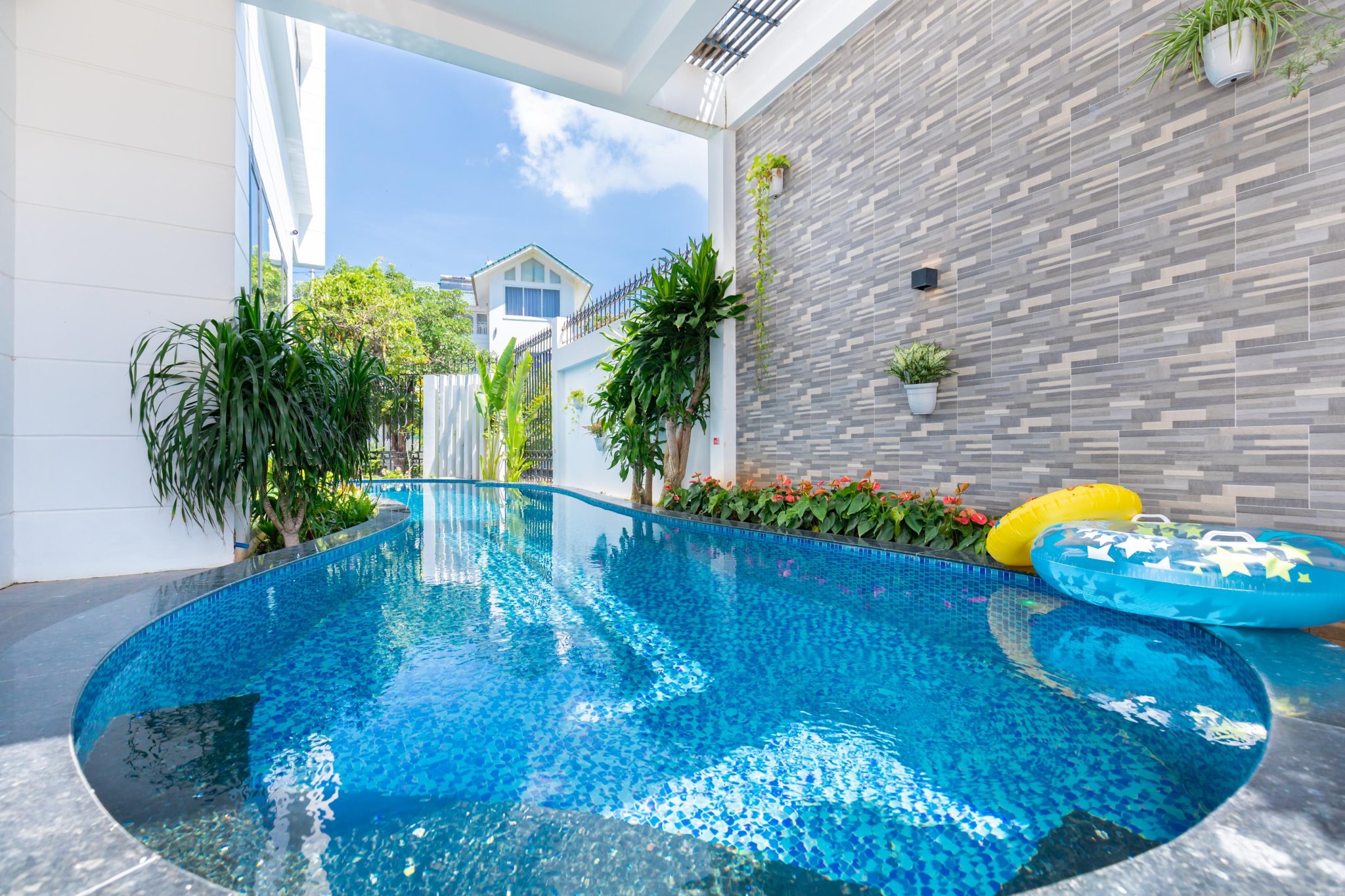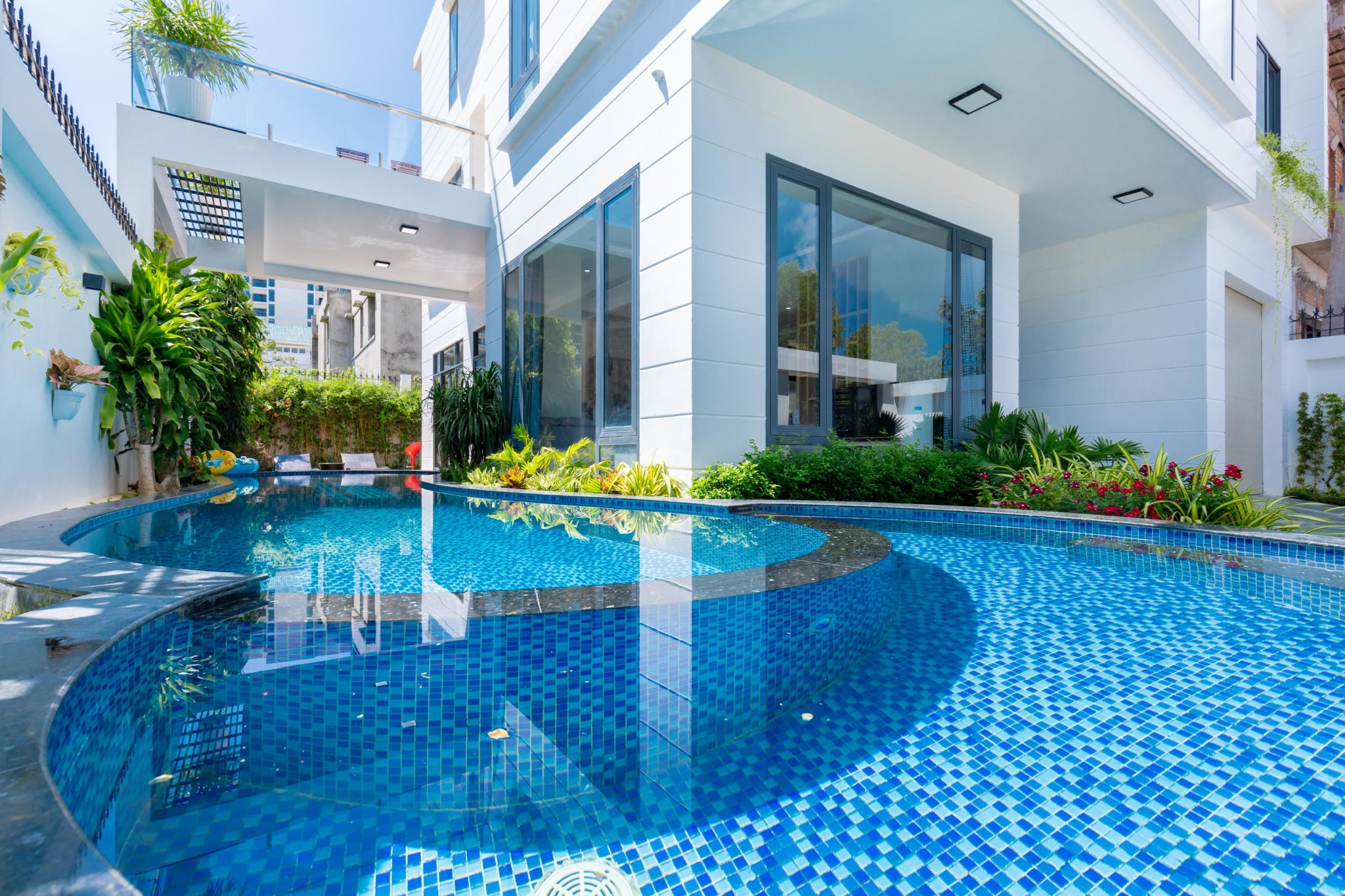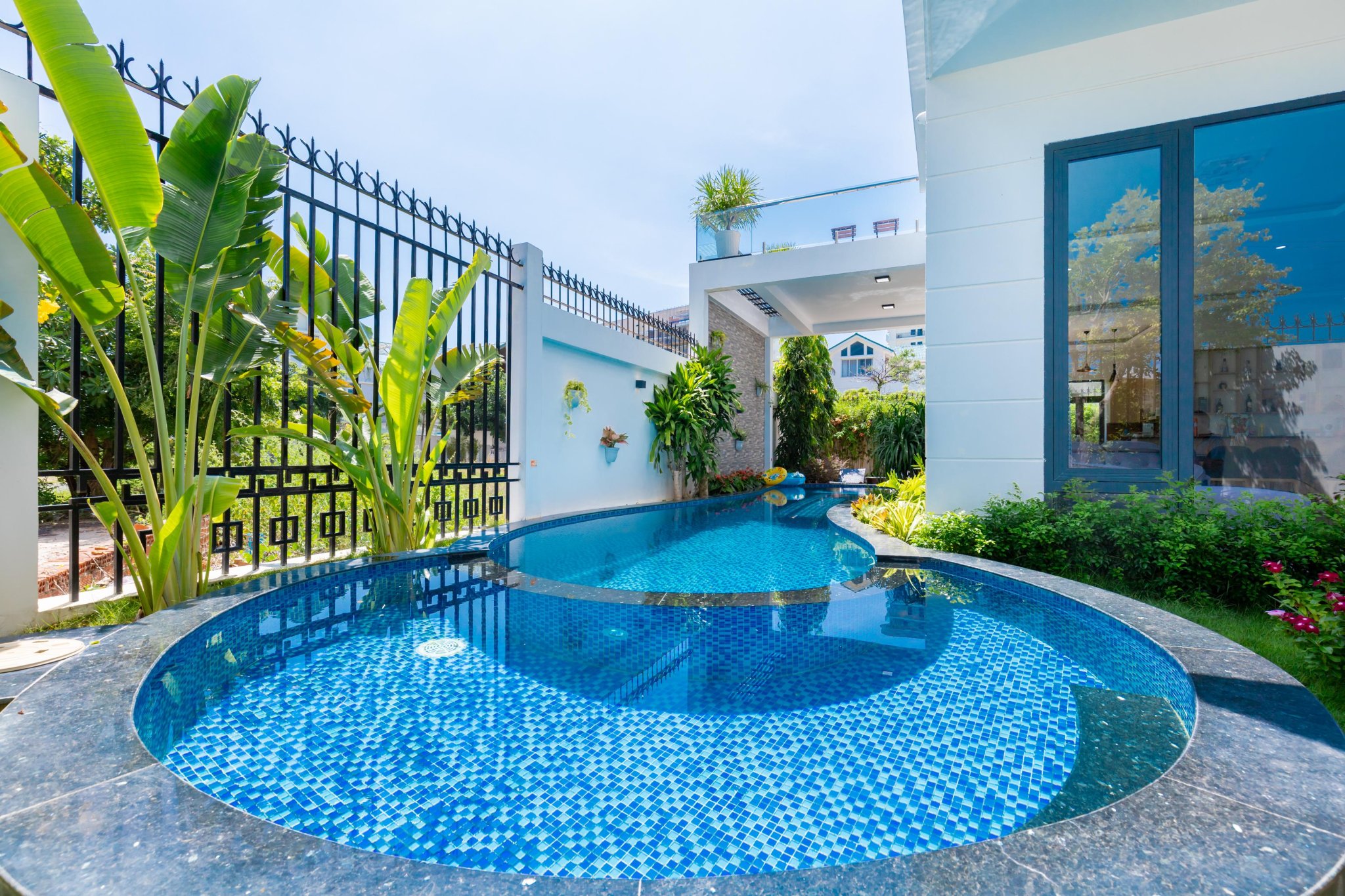 Hồ bơi dài uốn lượn tạo nên nét chấm phá, thăng hoa cảm xúc khi tổ chức các buổi pool party tại villa